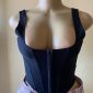 Black women's corset-style top with a hook-and-eye front closure and wide straps